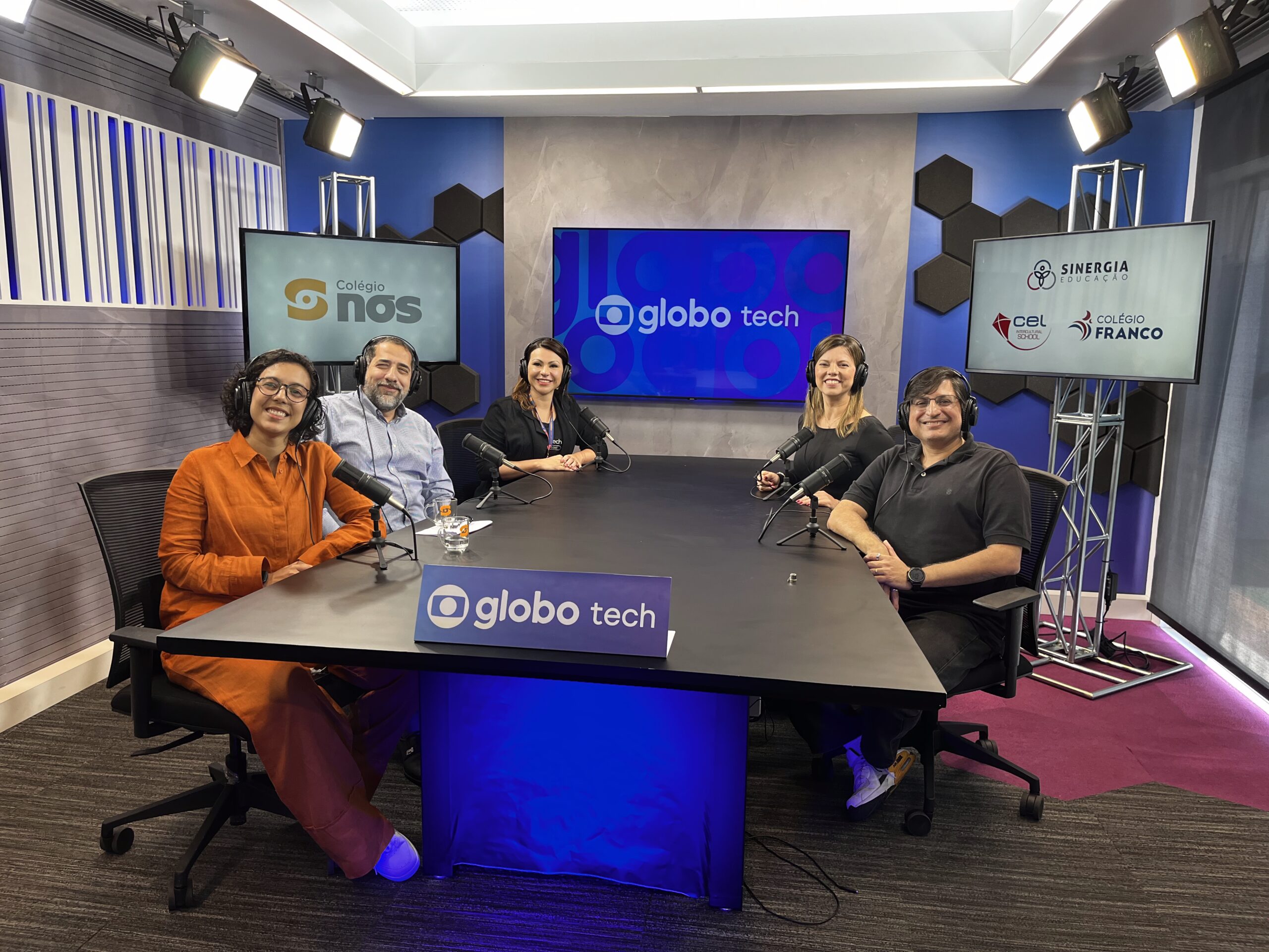 A Diretora Acadêmica, Lucimar Motta, e o Coordenador de Tecnologia Educacional, Eduardo Levy, participaram da gravação do podcast “A Inteligência Artificial nas Escolas”, produzido pela Globotech.