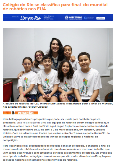 Em matéria publicada pelo portal Estúdio B Notícias, o time foi reconhecido pela classificação para a final da First Lego League Explore, um dos maiores campeonatos de robótica educacional do mundo.