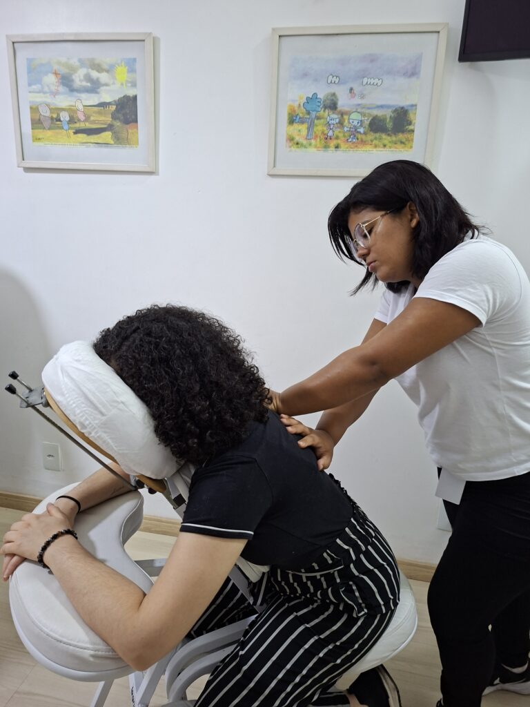 Além disso, proporcionamos um momento de pausa e autocuidado com uma estação de massagens, convidando nossas colaboradoras a desacelerarem e a se reconectarem consigo mesmas em meio à rotina.